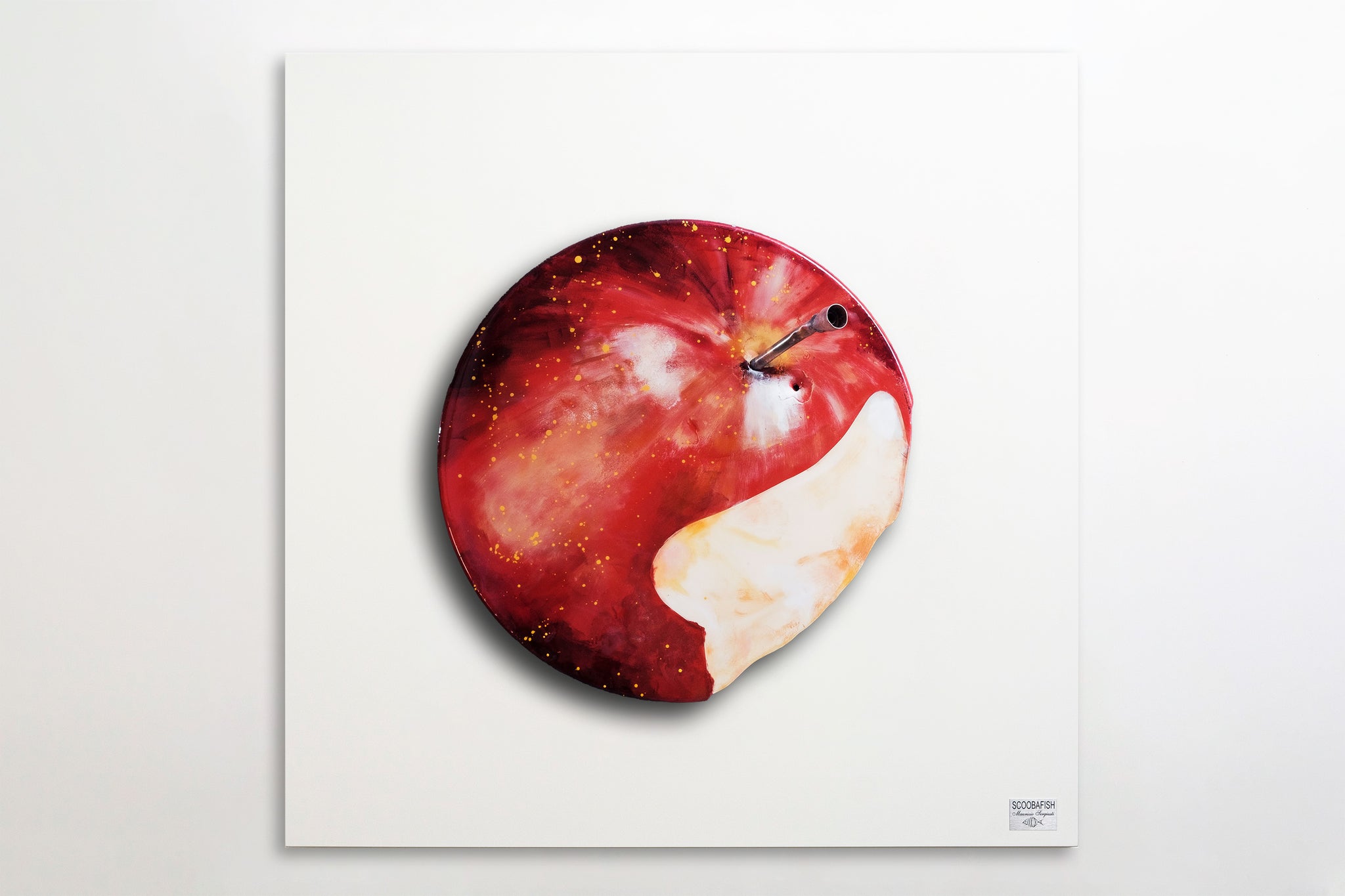 The artwork emerges from a discarded road sign recovered in Sardinia, marked by salt corrosion and years of exposure to the elements. The metal is shaped to recreate the organic apple form, while the bite - central element of the composition - becomes a conceptual statement beyond visual detail. The original material's imperfections (dents, bullet hole marks, rust) are intentionally preserved, creating a fascinating contrast with the glossy surface of the final epoxy resin coating.