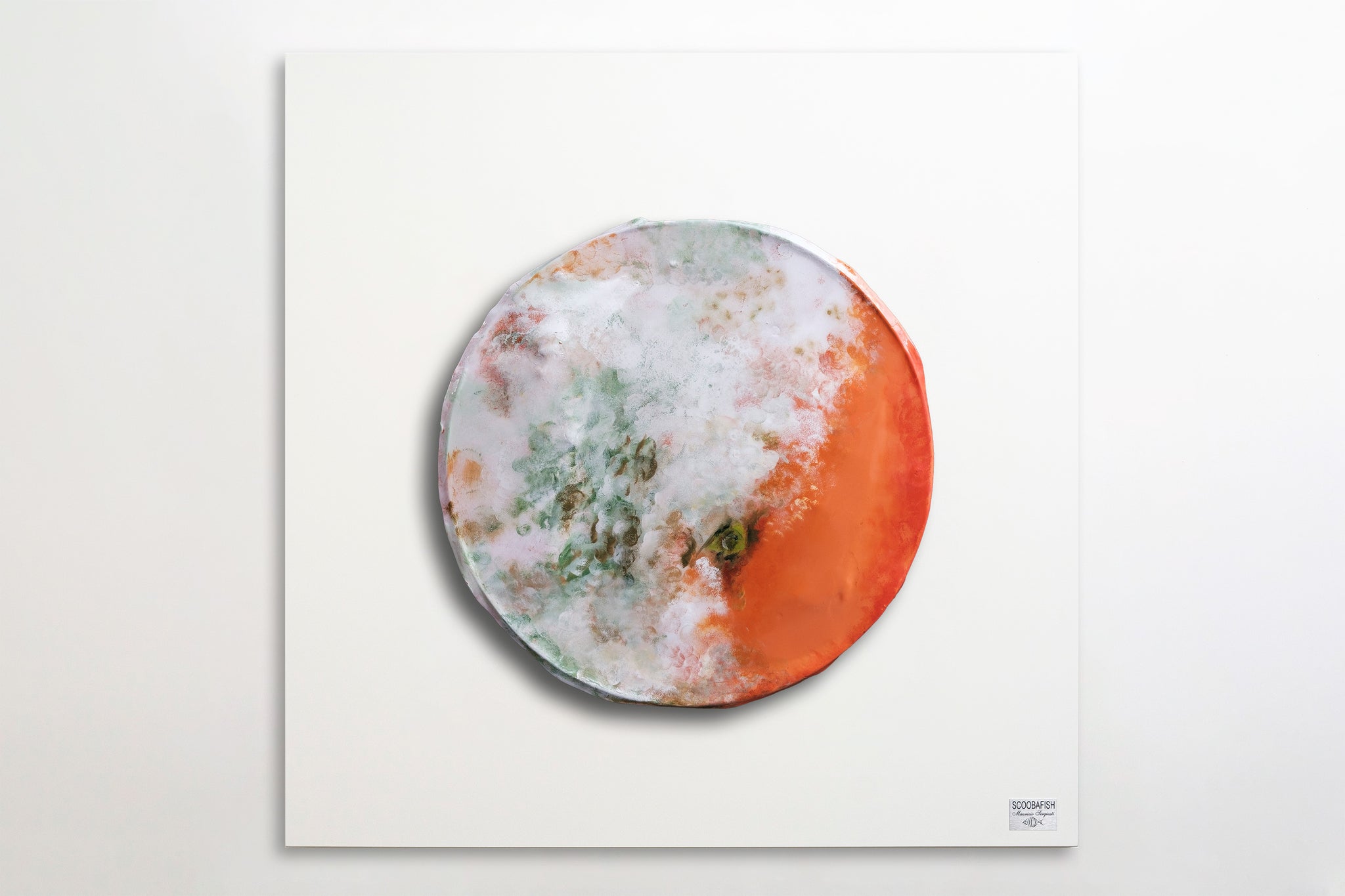 Hand-painting with eco-friendly paints contrasts the original orange of the fruit with green and brown stains of invading mold. The "molding" process is painted with scientific attention: spores start from the moistest points, expand in patches, progressively conquer the entire surface. The final epoxy resin crystallizes this moment of maximum decomposition, freezing time at the instant before total dissolution.